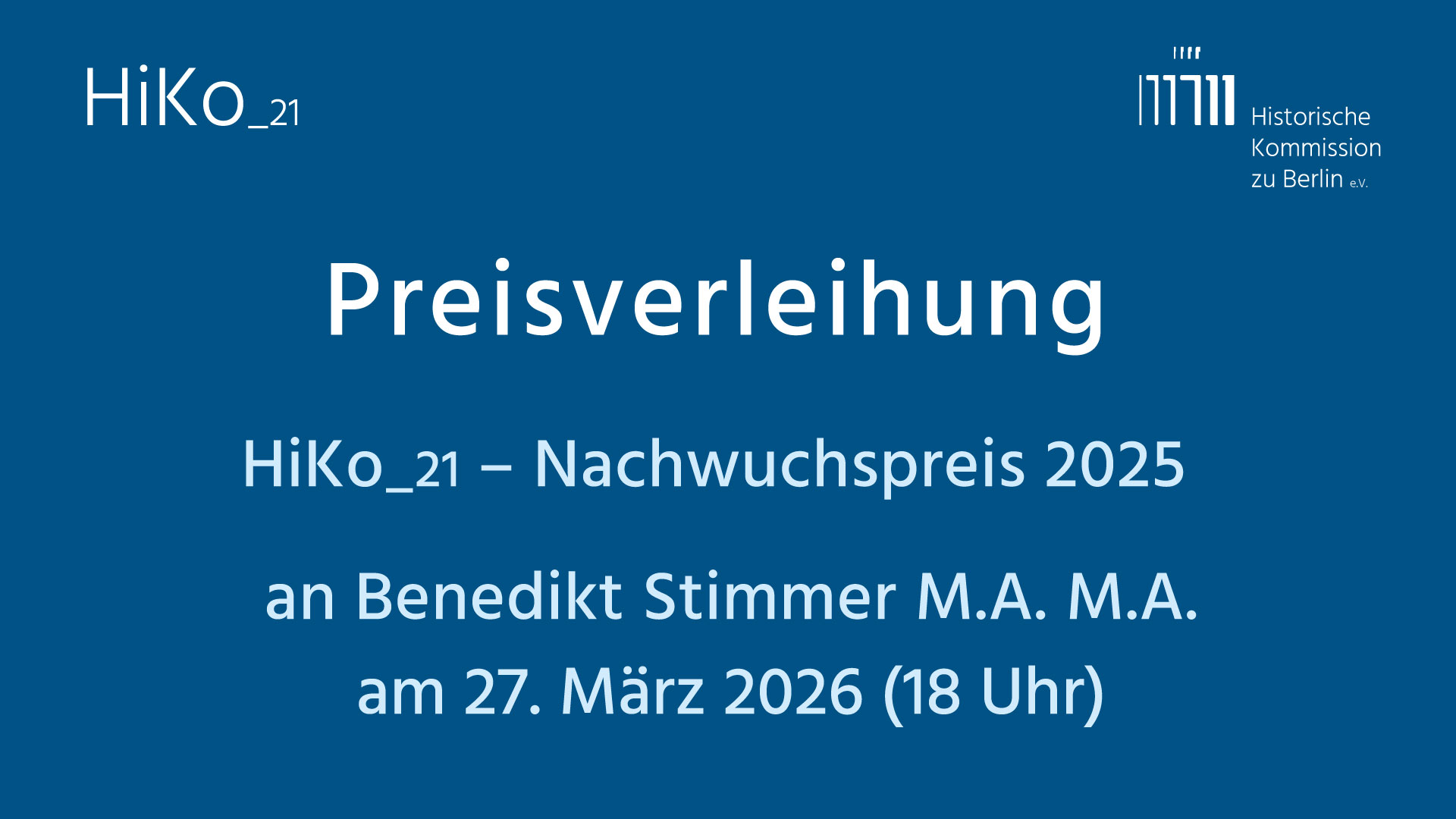 Die Preisverleihung findet am 27. März 2026 um 18 Uhr im Vortragssaal der Historischen Kommission (Kirchweg 33, 14129 Berlin) statt. Die Einladung finden Sie hier.