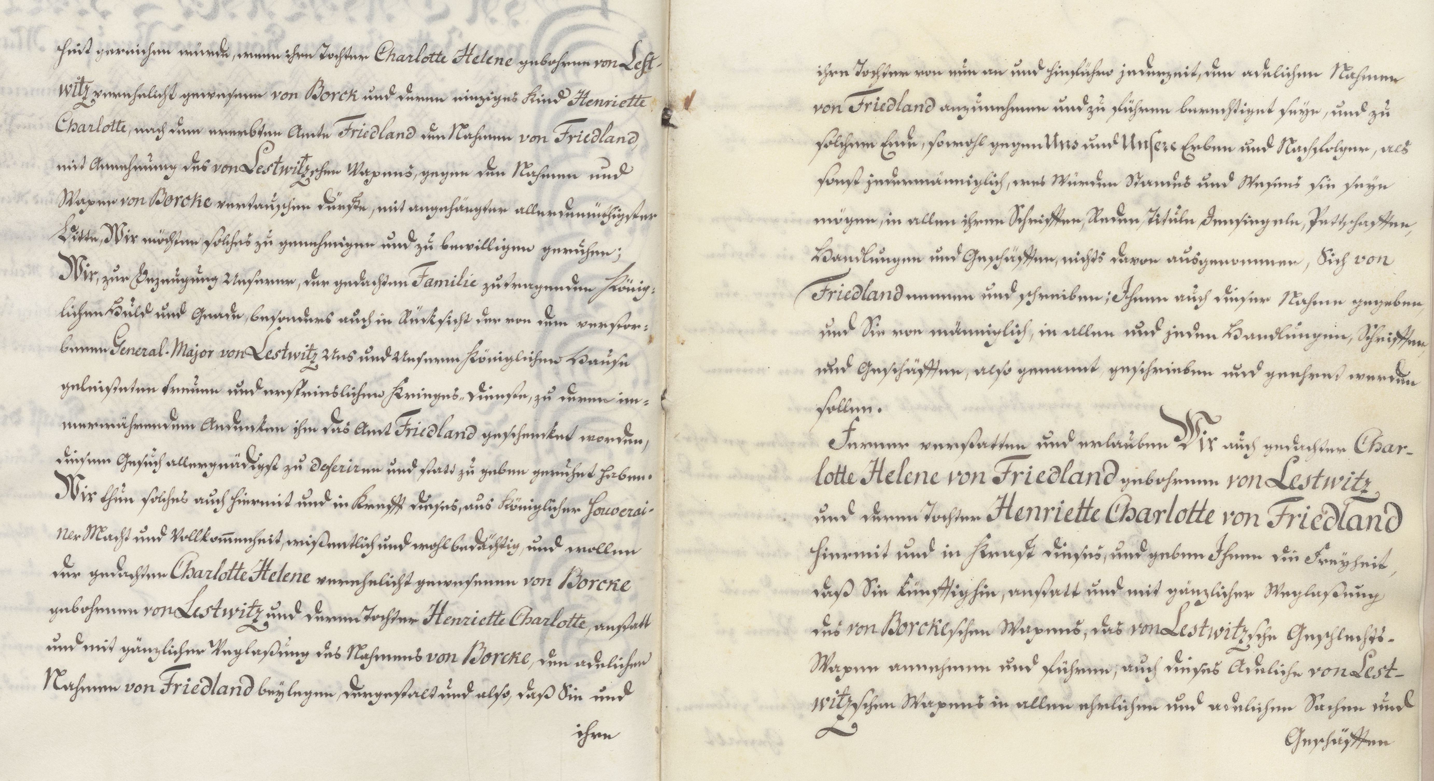 Thun kund und bekennen hiermit und in Kraft dieses offenen Briefes, für Uns und Unsere Erben und Nachfolger am Königreich, daß Nachdem Wir aus angestammter Clementz und Mildigkeit, unabläßig bemühet sind Unserer getreuen Vasallen und Unterthanen Bestes und Wohlergehen auf alle Weise zu befördern und zu vermehren; und Uns denn die verwittwete GeneralMajorin von Lestwitz gebohrne von Treskow allerdemüthigst zu vernehmen gegeben: wasgestalt es aus den von Ihr angeführten Ursachen zu ihrer und ihrer Familie besondern Beruhigung und Zufrieden- [zweite Seite] heit gereichen würde, wenn ihre Tochter Charlotte Helene gebohrne von Lestwitz verehelicht gewesene von Borck und deren einziges Kind Henriette Charlotte, nach dem ererbten Amte Friedland den Nahmen von Friedland mit Annehmung des von Lestwitzschen Wapens, gegen den Nahmen und Wapen von Borcke vertauschen dürfte, mit angehängter allerdemüthigster Bitte, Wir möchten solches zu genehmigen und zu bewilligen geruhen; Wir, zur Bezeugung Unserer, der gedachten Familie zutragenden königlichen Huld und Gnade, besonders auch in Rücksicht der von dem verstorbenen General-Major von Lestwitz Uns und Unseren Königlichen Hause geleisteten treuen und ersprieslichen Krieges-Dienste, zu deren immerwährendem Andenken ihm das Amt Friedland geschenket worden, diesem Gesuch allergnädigst zu deferiren und statt zu geben geruhet haben. Wir thun solches auch hiermit und in Kraft dieses, aus königlicher souverainer Macht und Vollkom[m]enheit, wißentlich und wohlbedächtig, und wollen der gedachten Charlotte Helene verehelicht gewesenen von Borcke gebohrene von Lestwitz und deren Tochter Henriette Charlotte, anstatt und mit gänzlicher Weglaßung des Nahmens von Borcke, den adelichen Nahmen von Friedland beylegen, dergestalt und also, daß Sie und [dritte Seite] ihre Tochter von nun an und hinführo jederzeit, den adelichen Nahmen von Friedland anzunehmen und zu führen berechtiget seyn, und zu solchem Ende, sowohl gegen Uns und Unsere Erben und Nachfolger, als sonst jedermänniglich, wes Würden Standes und Wesens sie seyn mögen, in allen ihren Schrifften, Reden, Tituln, Innsiegeln, Petthschafften, Handlungen und Geschäfften, nichts davon ausgenommen, Sich von Friedland nennen und schreiben; Ihnen auch dieser Nahme gegeben, und Sie von männiglich, in allen und jeden Handlungen, Schrifften, und Geschäfften, also genannt, geschrieben und geehret werden sollen.