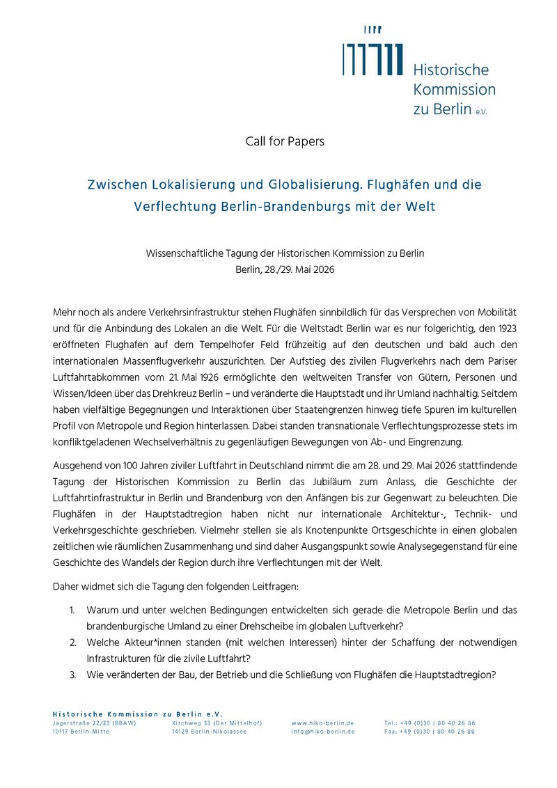 Based on 100 years of civil aviation in Germany, the conference of the Historical Commission of Berlin on 28 and 29 May 2026 will take the anniversary as an opportunity to shed light on the history of aviation infrastructure in Berlin and Brandenburg from its beginnings to the present day. The airports in the capital region did not only write international architectural, technical and transport history. A hubs, they rather put local history in a global temporal and spatial context and are therefore the starting point and object of analysis for a history of the region's transformation through its interdependencies with the world.
